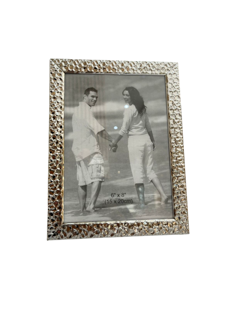 Un cadre photo raffiné à la finition métallique texturée, mettant en valeur une photographie de 15 x 20 cm représentant une scène de plage avec deux personnes se tenant la main.